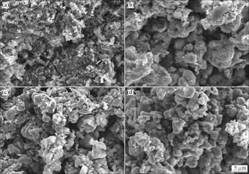 Figure 8 shows SEM images of the electrolysis products after electrolyzing for different time. The SEM image of the product electrolyzed for 1 h, as seen in Fig. 8(a), is similar to the pre-electrolyzed one in Fig. 3(b), which shows compact structure, but the particle size seems to be large. After 7-12 h electrolysis, the pellets become porous and the particles seem irregular (shown in Figs. 8(b), (c)). After electrolysis for 20 h, as seen in Fig. 8(d), the precursor was transformed into final product which shows spongy and porous with the nodular particles. The reduced pellets can easily be ground into powder with pestle and mortar.