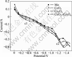 Fig. 9 Cathodic polarization curves of MCE in the absence and presence of CeO2 powder, Co3O4 powder and mixed CeO2 and Co3O4 powders in CaCl2 molten salt at 850 ℃ (Scan rate: 1 mV/s)