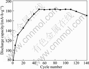 Cyclic voltammetric measurements were done in the potential range of -1100 to -300 mV (versus Hg/HgO electrode) to investigate the electrochemical property of CeCo5 powders. Figure 10 illustrates the cyclic voltammograms of the CeCo5 alloy microelectrode. The number on the curves represents the cycle number. The anodic peak observed is due to the oxidation of the desorbed hydrogen atoms on the surface, which is used for evaluating the discharge processes of the CeCo5 alloy. The discharge capacities were calculated based on the anodic peak areas after different cycles, as shown in Fig. 11. The activation of CeCo5 is almost complete after 50 cycles and the maximum discharge capacity obtained is 183 mA·h/g. It can be seen that after 140 cycles the capacity retention is approximately 92.8%.
