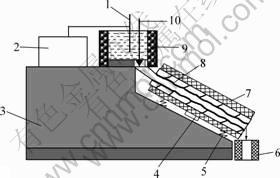 Fig.1 Schematic diagram of vibrating wavelike sloping plate process for semisolid forming (1—Thermocouple; 2—Temperature controlling station; 3—Base; 4—Vibration system; 5—Spring; 6—Collecting system; 7—Cooling chamber; 8—Wavelike sloping plate; 9—Stage casting; 10—Casting valve)