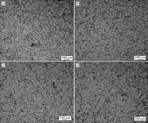 Fig.2 Microstructures of semisolid billets of AZ91D magnesium alloy prepared under different casting temperatures: (a) 630 ℃; (b) 650 ℃; (c) 660 ℃; (d) 690 ℃