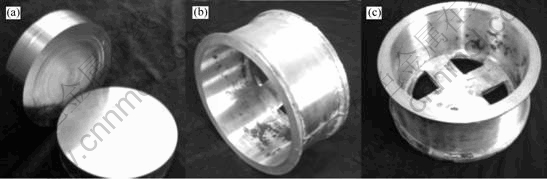 Fig.4 Product appearance of simulated wheel obtained by thixoforming: (a) Billet; (b) Outside; (c) Inside