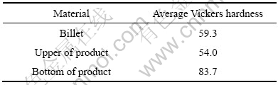 表1所列为原始坯料和制品不同位置处的平均维氏硬度。可以看出,由于触变压铸过程中液相流动为主要的变形方式,所以成品下部固相率高,晶粒之间接触紧密并发生微塑性变形,维氏硬度同时也得到提高,比其它部位的硬度大,为83.7。由于液相流动并在上部偏聚,成品上部液相率高,使上部液相率高于平均液相率,因此,制品上部硬度为54.0,不但低于下部硬度值,而且还低于初始坯料的硬度(59.3)。因此在进行触变成形时应该尽量避免液相的偏聚行为,使整个制品的硬度趋于一致。