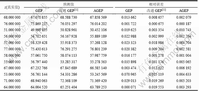 将AGEP算法运算后得到的预测值与GEP和文献[11]中改进的GEP进行对比实验,结果如表2所示。