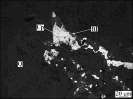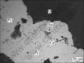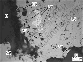 The gold-bearing sulphide minerals are composed of pyrite (Py), chalcopyrite (Cp), sphalerite (Bl) and galena. The gold-bearing gangue is composed of quartz (Q) and feldspar. 77.12% gold grain is in the sulphide mineral and 22.88% is in the gangue as listed in Table 1. Figures 1-4 show that the important gold-bearing minerals are composed of pyrite, chalcopyrite and quartz and change significantly compared with previous research. 62.00% gold occurs in the pyrite, 13.50% is in the chalcopyrite and 20.18% is in the quartz [7-9].