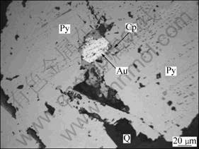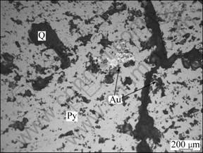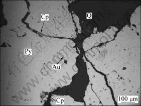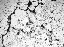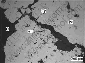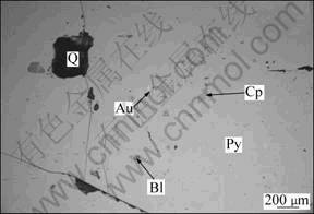 The chalcopyrite is the important gold-bearing mineral and main copper mineral, as shown in Fig. 7. The microscopy observation shows that the chalcopyrite is character of brass, dappled tarnish such as blue, purple and brown on the surface with strong metalluster because of oxidization, as shown in Fig. 8. The rigidity is 3-4 and specific gravity is 4.1-4.3. The grains of chalcopyrite are nonuniform and embed in the gangue.