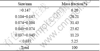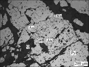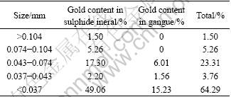 There are three crystals for the pyrite in crystallization periods, euhedral crystal in the pre-mineralization, hypautomorphic crystal and allotriomorphic crystal in the metallogenic epoch and euhedral crystal in the post- mineralization, as shown Figs. 5 and 6. The fragmentation of pyrite is caused by stress. The chalcopyrite associates with pyrite nearly and is wrapped by pyrite in metallogenic epoch. The fissure of pyrite is filled by chalcopyrite to prove synchroneity. The gold grains in the forms of fissure gold, inclusion gold and crystal fractured gold embed in the pyrite as the important gold-bearing minerals. The micro fine gold is difficult to liberate and is easy to lose. The minimal grain size of pyrite is 0.002 mm and the maximal grain size is 2.7 mm, and dispersed in the range of 0.037-0.147 mm as list in Table 2.