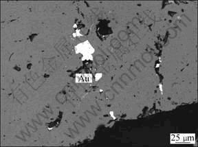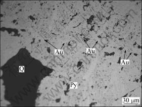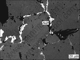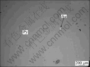 Jiaojia gold mineral owns large granularity from 3-5 μm to 100 μm, as listed in Table 6. 1.5% of gold grain is more than 0.104 mm, 5.26% is 0.074-0.104 mm, 23.31% is 0.043-0.074 mm, 3.76 is 0.037-0.043 mm and 64.29% is less than 0.037 mm. The results show that most of gold grains are less than 0.037 mm. The gold grains are distributed in the pyrite and chalcopyrite as large grain, distribution group or isolated grain. The small and isolated grains are distributed in the gangue, as shown Figs. 15 and 16.