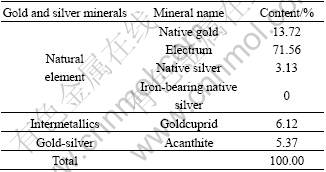 There are 98 kinds of gold minerals and gold- bearing minerals, 47 kinds of usual gold minerals and more than 10 kinds of industrial gold minerals in the world. There are 27 kinds of gold minerals in China. But there are no enough mineralogy data about gold. Gold mineral is divided into seven divisions and 13 subdivisions according to the crystal chemistry. There are plenty of gold minerals and silver minerals in the Jiaojia gold mineral, including native gold, electrum, native silver, iron-bearing native silver, goldcuprid and acanthite belonging to the first division (natural element), the second division (intermetallics) and the seventh (gold-silver sulphide) minerals as listed in Table 8 [10-11]. The process mineralogy research is very important for beneficiation process and flowage structure [12-15]. There are 88.14% goldargentid, 6.12% goldcuprid and 5.37% acanthite, and there is 71.56% electrum in the goldargentid. The average quality is 641.26‰ for goldargentid mine.