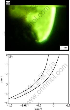 Fig. 2 Photograph of keyhole (a) and geometry of keyhole (b) in energy coupling model