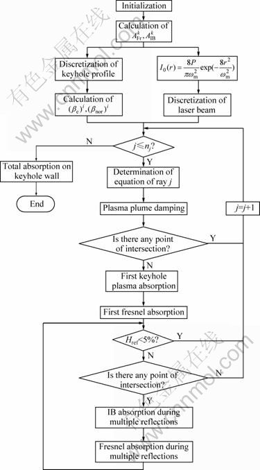 The absorption rate will be 1-R. IB absorption results from the presence of plasma inside the keyhole. The plasma absorbs the energy of the laser beam and then re-deposits the energy on the keyhole wall by radiation. An expression for the IB absorption coefficient is [25]