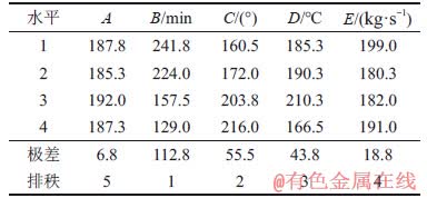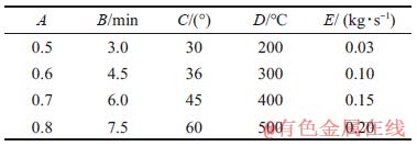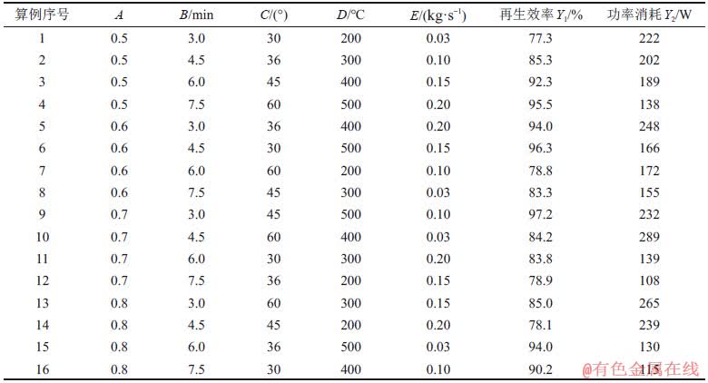 进行正交试验的目的主要是分析微波再生过程中关键参数对微波功率的影响程度,为最终实现再生过程控制参数的优化、提高再生效率提供依据[24]。根据微波再生过程的工作原理,选择孔隙率A、再生时间B、电机旋转角C、排气温度D、氧流量E这5个关键参数作为研究对象。表2所示为所选考察对象的因素水平。