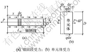 为了分析锚固段与周围土体之间的相对剪切位移,取锚索隔离体,其受力如图1(a)所示。从锚索隔离体中任取一个锚索单元,其受力如图1(b)所示。