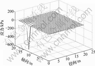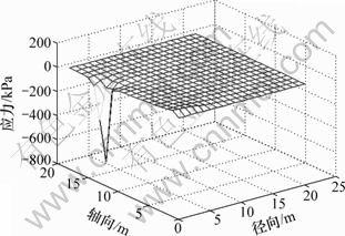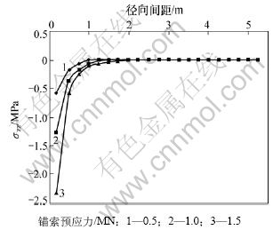 图6所示为根据锚索长度12.5 m处的正应力沿径向的分布而做成的曲线。从图6可以看出:灌浆体与岩体的正应力沿径向也呈衰减趋势;当张拉荷载较小(P=500 kN)时,正应力主要分布在注浆体周围0.5 m范围内,随着张拉力的增大,正应力逐渐向岩体周围扩散,但扩散的范围及幅度都不是很大,而且张拉力增大的直接后果是使得锚固浆体周围的应力更加集中,更容易造成浆体破坏而使锚索被抽出。