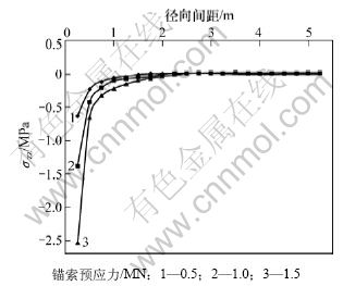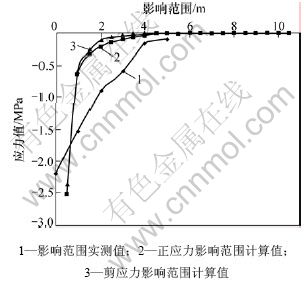 为对本文计算的锚固效应进行过测试,选定一排锚索(6根,锚索间距为1 m),在最左边1根锚索埋设测试元件,然后,按顺序依次张拉各根锚索,得出在测试锚索上的反映,可知邻锚效应区的范围为3.5~4.5 m,与图6和图8相比较,本次实测结果为相邻锚索相互影响间距,故应与图6与图8中应力影响范围的2倍相比较。从图10可以看出:实测邻锚效应区的范围接近于2倍正应力的影响范围。因此,本试验的结果与计算结果是比较接近的,即锚固段的影响范围应以正应力为标准进行控制。