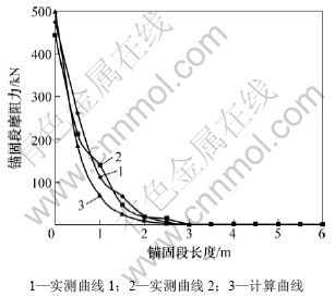 在本文研究中,选取典型锚索安装测试元件对锚索的应力进行观测,并与计算结果进行对比,结果如图9所示。从图9可以看出:实测结果与计算结果比较吻合,即在锚固段的前端最大,然后在1/3长度处迅速减小。但计算结果较实测结果更集中,且在锚索的前端计算结果比实测结果大,说明实际测量中由于锚索的张拉导致前端锚索与锚固体的摩阻力 降低。