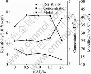 Fig.3 Dependence of resistivity, carrier concentration, and mobility of GZO/AZO thin film on Al-doping concentrations (Total doping concentrations of Al and Ga were fixed to 2% (molar fraction) for all samples. Substrate temperature of samples was 400 °C)