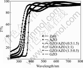 Fig.4 Optical transmittance spectra of GZO/AZO thin films as function of wavelength (Total doping concentrations of Al and Ga were fixed to 2% (molar fraction) for all samples. Substrate temperature of samples was 400 °C)