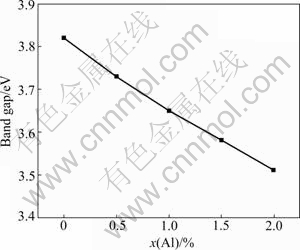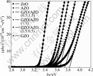 The band gap energy Eg can be calculated by extrapolating the linear part of the plot of α2 vs hn. Fig.5 shows the optical band gap calculated from the transmittance data using TAUC’s plot (αhn)2=C(hn-Eg), where α is optical absorption coefficient, Eg is band-gap energy, and hv is photon energy[18]. The optical band gap of energy of pure ZnO was 3.27 eV, and the band gap energy of GZO/AZO thin films linearly decreased as the Al ratio increased from 3.82 eV for GZO, 3.62 eV for GZO/AZO (1:1), and 3.52 eV for AZO, as shown in Fig.6. This trend is in good agreement with the previous results of PARK et al[19]. From this result we may suggest that Ga ions are more easily ionized than Al ions, but this assumption is not well agree with the electron concentrations data shown in Fig.3.