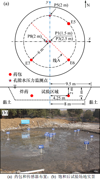 地震、冲击和爆炸等荷载作用下饱和砂土的液化问题是防灾减灾领域重要的研究课题[1]。随着城市地下爆破工程实施数量增多以及偶然爆炸事故和恐怖袭击的潜在威胁,由爆炸振动引起的饱和土体液化问题逐渐成为新的研究热点[2-3]。我国沿海局部地区广泛分布着高水位的砂土层,地下爆破或爆破拆除作业均是引起地基液化的潜在危险源,同时沿海经济发达区域仍是战时军事打击的主要目标,因此,开展爆炸荷载作用下饱和土体的液化特性研究具有重要的意义。爆炸荷载引起的土中超孔隙水压力上升、地表质点振动、土体应变等参量常作为评价饱和土爆炸液化的标准[4]。STUDER等[5]基于饱和砂土中的单药包爆炸试验,提出了基于药量和爆距的爆炸液化经验公式。ASHFORD等[6]开展了原位场地的多药包爆炸液化试验研究,分析了药量、药包布置等爆炸参数,并制造了大面积振动液化环境。王兰民等[7]利用人工微差爆破地震动模拟天然地震动强度与振次,证实了黄土液化的客观存在性。现有研究结果表明,利用微差爆炸模拟地震液化环境的手段可以作为振动模拟环境的补充方法。然而,目前对于多点微差爆炸液化试验的参数设计和优化仍依赖经验和试点试验。为开展大型振动液化场地RC结构和土质堤坝的灾变试验,需要对爆炸参数进行优化。由于土中爆炸问题的复杂性,试验是进行爆炸参数优化的首要方法。开展爆炸试验往往受限于技术难度、风险、可重复性以及成本等因素,而经过试验验证的数值方法可以作为爆炸试验的验证及补充。张智超等[8-9]利用LS-DYNA有限元软件对饱和土中爆炸引起的超孔隙水压力进行了数值模拟,验证了LS-DYNA在分析爆炸液化问题中的可行性和有效性。因此,本文作者基于室外大型饱和砂土场地开展的多点微差爆炸液化的试验,建立全耦合数值计算方法,以验证数值手段的有效性和可行性,并在此基础上对药量、延时等参数进行优化分析。研究结果可以为全尺寸爆炸液化试验的设计参数提供切实有效的依据和参考。