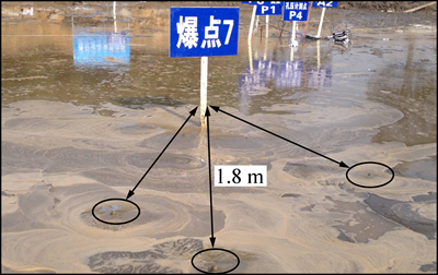 药包起爆后约2 min,试验坑内靠近药包E7附近区域出现冒水喷砂现象,表明该区域已经发生了液化,如图2所示。其他爆点附近也能观测到同样的现象,但场地中心附近并不可以观测到直接的液化现象,液化发生是个随机过程,与场地内土体松软差异、排水通道等因素有关,液化现象和孔隙水压力并不一定完全对应。经分析场地中心区域超孔隙水压力比的时程曲线(图3)并结合表1结果,在场地中心的药包布置平面及以下区域并未达到完全液化状态。