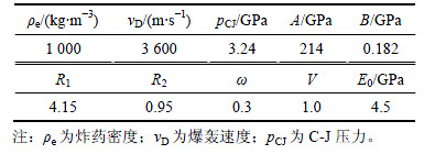 采用高能炸药燃烧模型和Jones-Wilkins-Lee (JWL)状态方程描述炸药的爆燃过程,状态方程描述了爆轰产物的压力p,相对体积V和爆轰产物比内能E0的关系[15]: