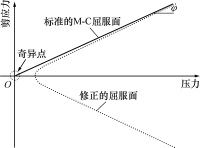 通过评价LS-DYNA土体材料库,MAT 147适合描述完全饱和砂土的性状[17]。该模型采用修正的莫 尔-库仑屈服面以避免低应力时屈服面与静水压力轴交汇的奇异点,如图4所示。