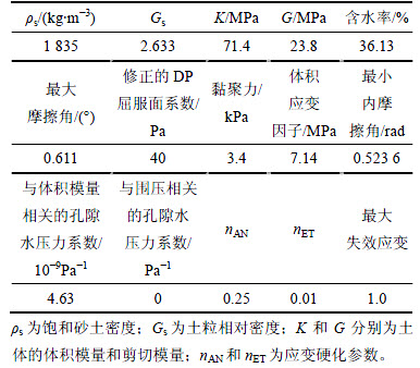 根据试验砂土物理力学性质及文献给出饱和砂土的计算参数[17-18],如表3所示。饱和黏土的饱和容重为21.5 KN/m3,土粒相对密度为2.7,体积模量为120 MPa,剪切模量为30 MPa,内摩擦角为35°,黏聚力为20 kPa,含水率为26.5%,孔压系数Ksk=0,即不考虑孔压的发展。