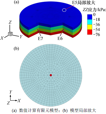 数值模型的计算域直径为16 m,深度4 m,其中0~3 m为饱和砂土层,3~4 m为饱和黏土层。集中药包设置为六棱柱形,每个装药质量为0.6 kg,如图5所示。数值模型上表面为土体与空气接触的自由面,在模型四周定义无反射边界,底部全约束。数值计算第一步利用动态松弛技术进行模型的初始地应力平衡,作为爆炸动力计算的预加载。数值计算有限元模型及应力初始化后的几何模型如图5所示。药包周围对有限元网格进行加密,单元最小宽度为0.05 m,初始时间步长为7.15×10-6 s。