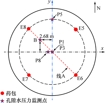 爆炸液化试验选用的2号岩石乳化炸药密度为0.95~1.10 g/cm3,爆速为3 600 m/s。该炸药在饱和土中的爆燃性能可以近似以水下爆轰性能衡量,根据水下爆轰试验结果,该炸药的等效TNT当量系数为0.8[12]。饱和土中发生封闭爆炸的临界埋深通常需达到2.5 m/kg1/3以上[13-14],因此,试验中设计3个质量均为0.6 kg的乳化炸药,埋置半径和深度分别为6 m和2 m(图1),尽量使爆炸能量作用于土中孔隙水压力的上升。药包E5-E6-E7依次起爆,相邻药包起爆间隔为110 ms。