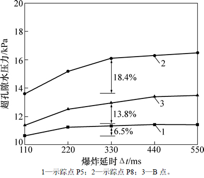 3) 当爆炸延时从110 ms增至330 ms时,爆炸引起的饱和土中超孔隙水压力改变明显,多药包爆炸后在场地几何中心附近更容易形成爆炸波的叠加,从而导致该区域的示踪点更易受爆炸延时改变的影响,计算结果显示优化爆炸延时后场地中心测点处的超孔隙水压力可以提高18%以上。