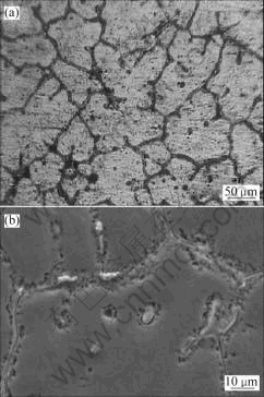 Fig.1 Microstructures of as-cast alloy: (a) OM image; (b) SEM image