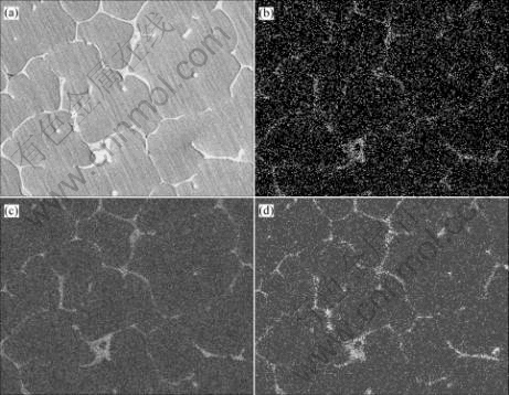 Fig.2 Microstructure of as-cast alloy(a) and corresponding elements planar distributions of Zn(b), Mg(c) and Cu(d)