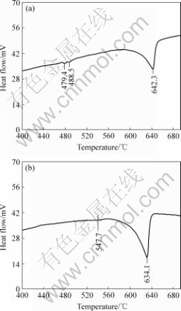 Fig.4 DSC analysis curves of tested alloys: (a) As-cast alloy; (b) Alloy homogenized at 465 ℃ for 24 h