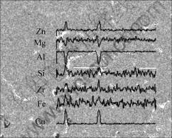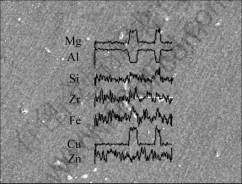 对铸态组织中的合金元素分别进行面扫描和线扫描,其结果分别如图2和3所示。由图2可见,铸态组织中合金元素的分布是不均匀的。在晶界与枝晶间及其非平衡第二相中主要合金元素显著富集,存在严重的枝晶偏析;在晶粒内部,越靠近晶界附近,合金元素含量越高,存在区域偏析。由图3可看出,在较宽大的共晶化合物处,其线扫描的波峰往往有两个峰,说明共晶体内合金元素的分布也是不均匀的。因此,在热加工前必须进行均匀化退火,以消除成分偏析。