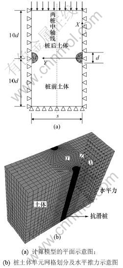 取一定厚度的桩土体作为分析对象,其平面俯视图如图1(a)所示。抗滑桩桩径为d,桩间中心距为s,桩长为h,土体为均质土层,在桩土之间设置无厚度的接触面单元,排桩的前后计算区域均取为10d,以减少边界效应对模型的影响。模型的边界约束条件为:对称边界采用 y 方向全约束, 前侧边界采用x 向约束,桩底固定, 桩顶自由, 有限差分的网格划分如图 1(b)所示。滑坡推力采用在土体侧面施加均布荷载, 模拟滑坡推力使土体和桩发生侧向运动。模型计算至最大不平衡力达到一个相对较小的值,若最大不平衡力比率为10-5,则计算终止,认为模型内部应力重分布完成。