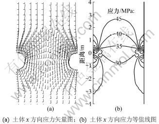 基本算例中取抗滑桩桩径d=1 m,桩间中心距为L=4d,桩长为h=10 m,土体为均质土层,桩土体的计算参数见表1,接触面单元的法向刚度kn和切向刚度ks均为1×107 kN/m,桩后均布载荷为50 kPa/m。通过计算得到图2所示的土体最大x方向应力σx矢量图以及x方向应力等值线图。