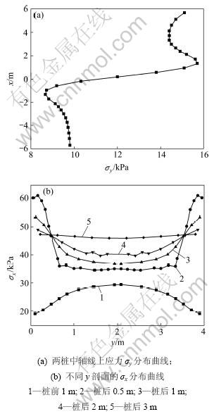 Fig.4 Variation of stress component (σx) along critical y-section line under different pile spaces