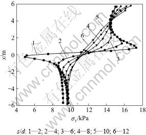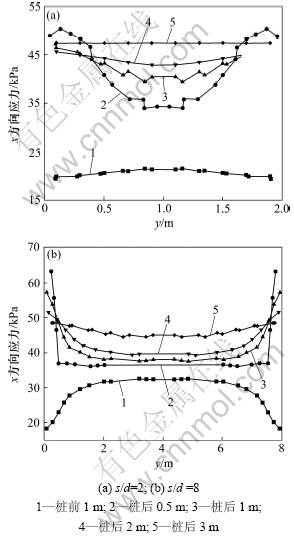 在基本算例的基础上,对桩间距与桩径之比s/d分别等于2,6,8,10和12时的模型进行计算。图4所示为s/d=2和8时桩前和桩后一些关键剖面上的应力分量σx分布曲线图,图5所示为不同桩间距条件下2桩中轴线截面上各点的y方向应力分布曲线图。
