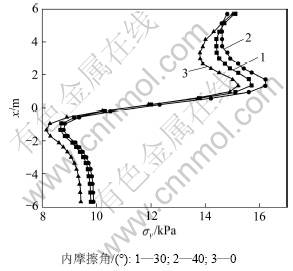 Fig.6 Variation of stress component (σy) along central line between two piles under different internal friction angles