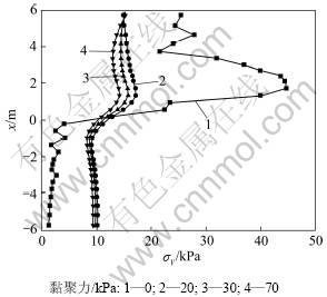 在基本算例中其他参数不变的情况下,分别对土体在黏聚力c=0,20,40,70,100 kPa等情况下进行计算分析。图7给出了4种不同黏聚力下两桩中轴线上应力σy分布曲线。经计算发现,随着土体黏聚力的增大,土拱形状由三角形发展成椭圆形和拱形,黏聚力在70 kPa以上土拱形状变化不大;随着土体黏聚力的增大,土拱效应越明显,桩后土拱范围扩大,桩后应力偏转现象越明显,桩的荷载分担比增大。