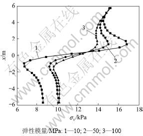 Fig.8 Variation of stress component (σy) along central line between two piles under different elastic modulus