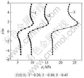 Fig.9 Variation of stress component (σy) along central line between two piles under different Poisson’s ratios