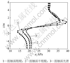 和c′=0模拟桩土之间光滑接触,从而分析接触面性状对土拱效应的影响。图10所示为3种不同接触面性状下两桩中轴线上y方向应力σy变化曲线。