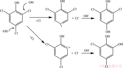 (2) UV/H2O2降解2,4,6-TCP 主要是通过氧化脱氯完成。在羟基自由基·OH作用下,2,4,6-TCP上的一个氯原子被氧化脱去并被羟基取代,生成二氯对苯二酚或二氯邻苯二酚,无法得到彻底矿化,需要在UV/H2O2工艺基础上进一步优化改善技术,使2,4,6-TCP矿化完全。