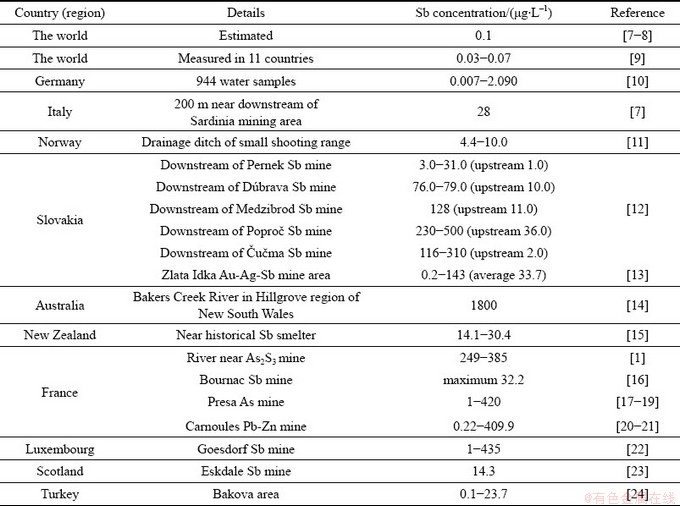 水体中锑的天然来源包括岩石风化、土壤径流、大气沉降。全世界范围内未受污染地表水中锑含量的平均值<1 μg/L。当受到金属矿区采选冶炼等人类活动影响时,水体中锑含量会显著增加。世界各地及典型金属矿区地表水中锑含量分析结果汇总于表1中。