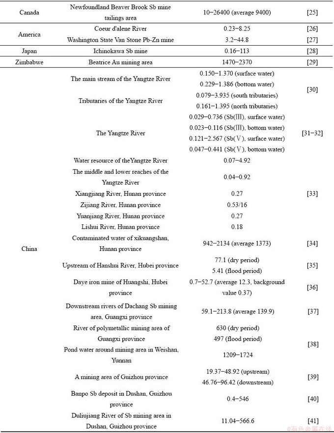 Table 1 Content of Sb in surface water in typical areas at home and abroad