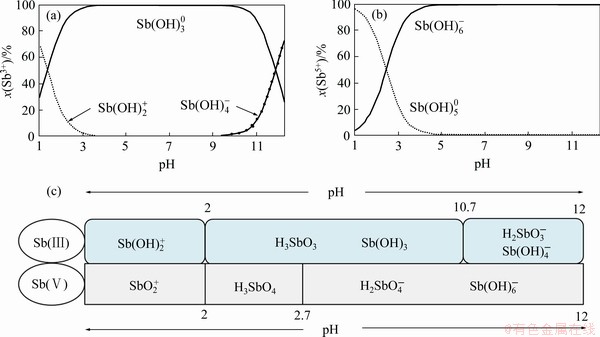 Fig. 1 Ion fraction diagram of Sb(Ⅲ)(a) and Sb(Ⅴ)(b) in water, and main chemical speciation(c) of Sb in water[63-64]