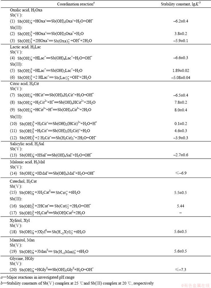 起作用[68]。但后续研究证实Sb(Ⅴ)在中性水体中会与多种小分子配体配位结合。TELLA等 [63, 69]发现当水体中(pH=3~9)存在多重羧基、羟基羧酸、脂肪族羟基和酚羟基时,中心Sb(Ⅴ)原子会与6个羟基氧原子结合形成八面体配位结构,进而可通过两个Sb—O—C键与羟基相邻的苯环、脂肪酸羟基和羧基等官能团形成两个五边或六边螯合环。Sb(Ⅴ)与草酸、乳酸和柠檬酸等发生配位反应的化学计量比通常为1:1或1:3,具体的配位反应及配合物形态如表3所示。