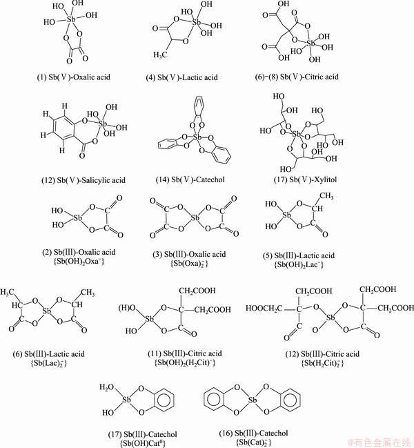 Sb(Ⅲ)的有机配位体结构十分多变,三配位时为三角锥形,四配位时为四面体或畸变四面体;五配位时为三角双锥形或正方锥形,六配位时为八面体形[70]。TELLA等[63]研究发现Sb(Ⅲ)在pH=3~9条件下会与多重羧基、羟基羧酸和芳香基等形成稳定配合物,配位反应和配位形态列于表3中。配合过程中,三角锥体型的